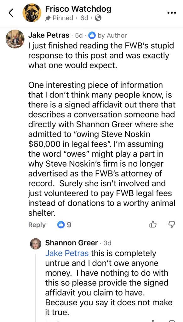 Let’s discuss the continued rumors by regular every day ole citizens like Jake Petras. In one comment under Bill’s post he claims, “there is a signed affidavit out there that describes a conversation someone had directly with SG where she admitted to owing Steve Noskin $60k in legal fees.”