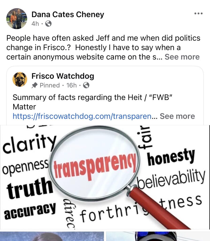 Ask me why I started Frisco Chronicles and you might be surprised by the answer.  I supported a young lady who filed five ethics complaints against the city council.  I went every other week with her to citizens input and watched how Cheney and the other council members dismissed her as crazy.  How the Cabal Insiders attacked her online and somehow, they leaked personal information on her that no one should know.  I defended her and I did so because it was the right thing to do.  I do not regret standing by this person back then, and she had the guts to do what many of us have talked about for years relating to corruption in Frisco.  Where was the backbone of support then for her?  That is why I started Frisco Chronicles and as I have said before I stand behind everything I have written.  If something is wrong, I will correct it or update it.