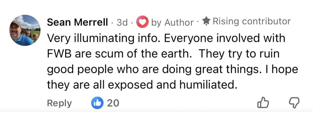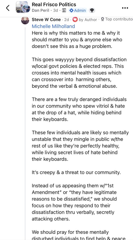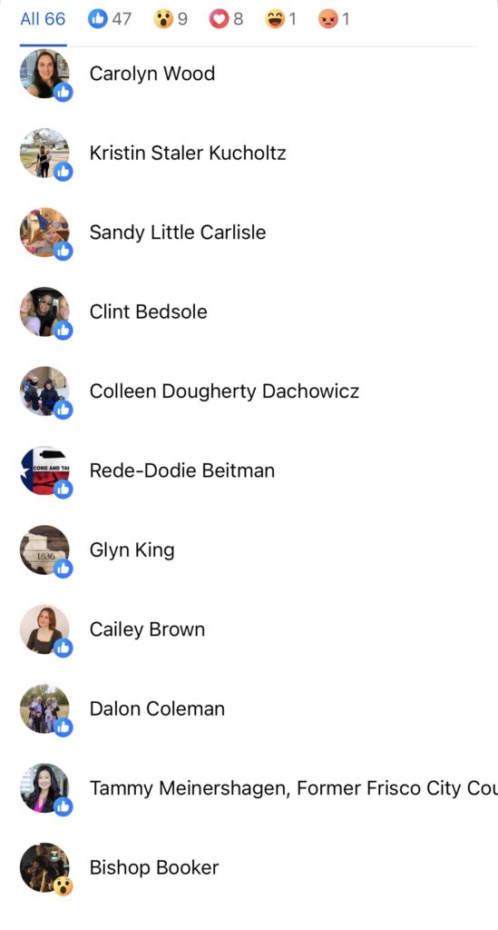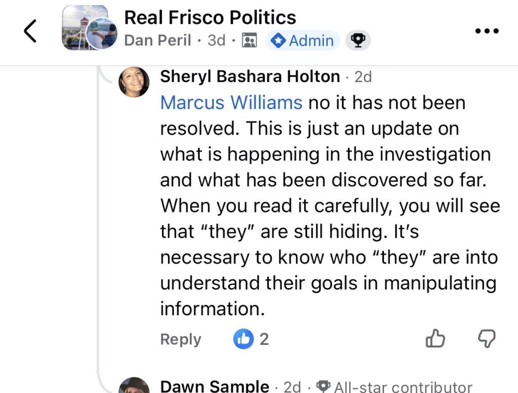 Bill lists residents who donated to a GFM so they must be guilty or connected with Frisco Chronicles. Shame on the bobblehead. Well, should we list all the names on the Karmelo Anthony Go Fund Me that also coincide with FRWC Facebook page and those who like the or commented on that post, then assume they are linked. Because they are linked, they must be guilty of supporting an alleged accused murder. Surely, they are guilty of something and probably donated because of that post by the plaintiff, right?  No – that is a ridiculous notion, and common sense can tell you that.