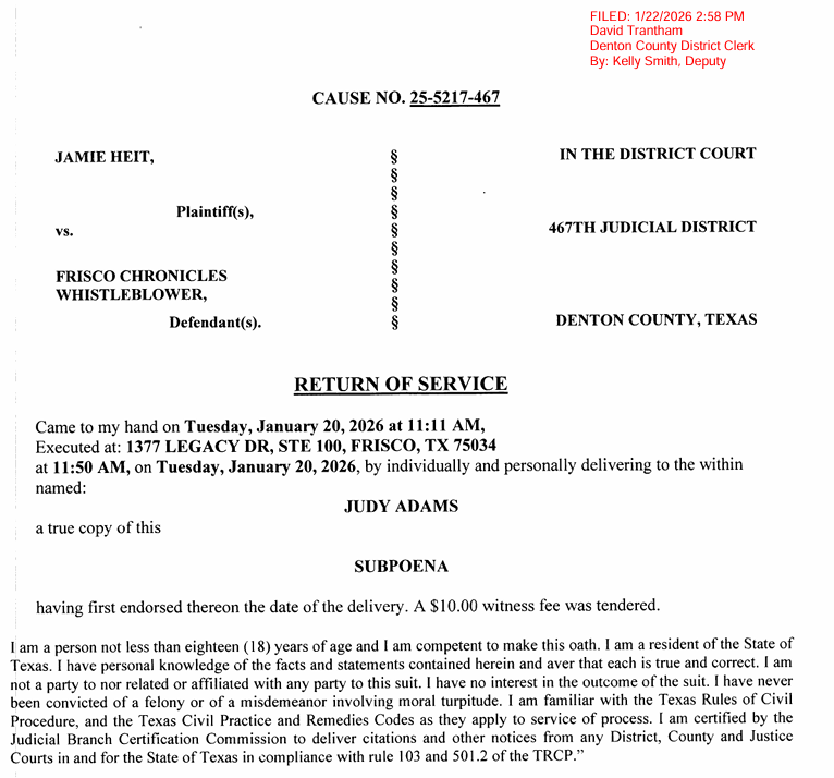 Frisco Chronicles believes back in January, when the Plaintiff’s counsel, Ryan D. Martin, telephoned Ms. Harville, it was not because he was looking for the truth. More he was looking to fill a narrative the Plaintiff’s team already had in place, which was Shannon Greer was the mastermind of it all.  It would be nice if Mr. Martin or Bobblehead Bill released a list of who “the several individuals” are?  Because there are none!