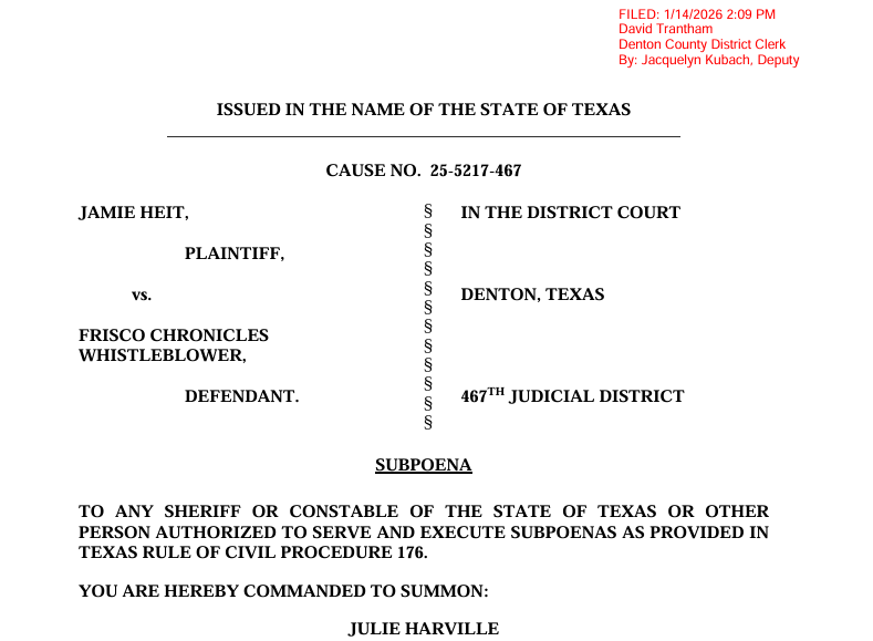 If I were Harville, I would have taken Mr. Martins “if you don’t tell me, we will subpoena you” as a threat.  It is basically saying give me what I want, or else.  Mr. Martin stated, “We’re sick of everyone giving us the runaround” but maybe, just maybe, everyone was not giving you the runaround.  Since Frisco Chronicles started there have been numerous accusations and rumors as to who it could be.  Groups of friends trying to guess coming up with their own narratives – but that does not make it true.