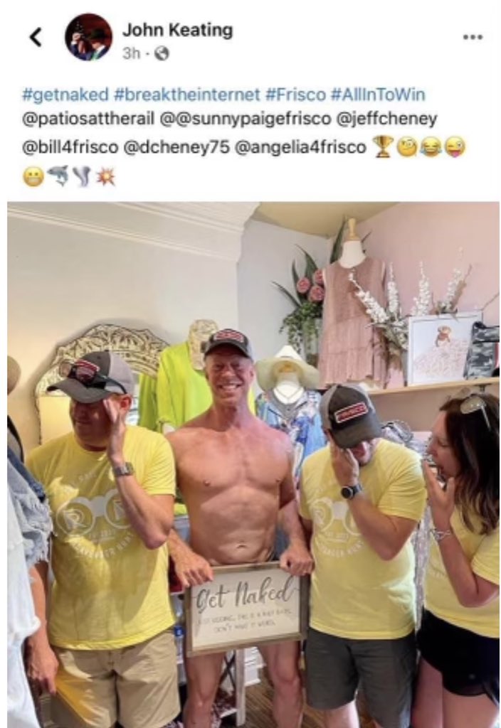 In 2021, when Councilman John Keating, Place 1 (now mayoral candidate) held up a sign during a Rail District Scavenger Hunt with the words “GET NAKED” covering his genital area creating the appearance he was naked (luckily, he had boxer shorts on). Wasn’t that you Mr. Woodard, the Mayor and the Mayor’s wife snickering in the picture?