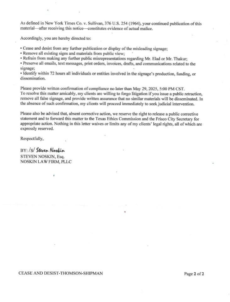 Tracie recounted receiving a Cease & Desist letter dated May 30, 2025, from attorney Steven Noskin, on behalf of council candidates Jared Elad and Burt Thakur, relating to alleged false and misleading campaign advertising connected to the Frisco Firefighters Association.