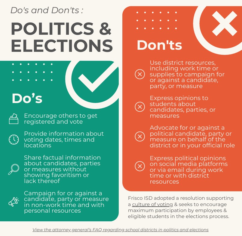 Frisco ISD, like most school districts, holds its staff to a standard of neutrality when representing the district. They adopted a resolution supporting a culture of voting and seeks to encourage maximum participation by employees and eligible students in the election process.