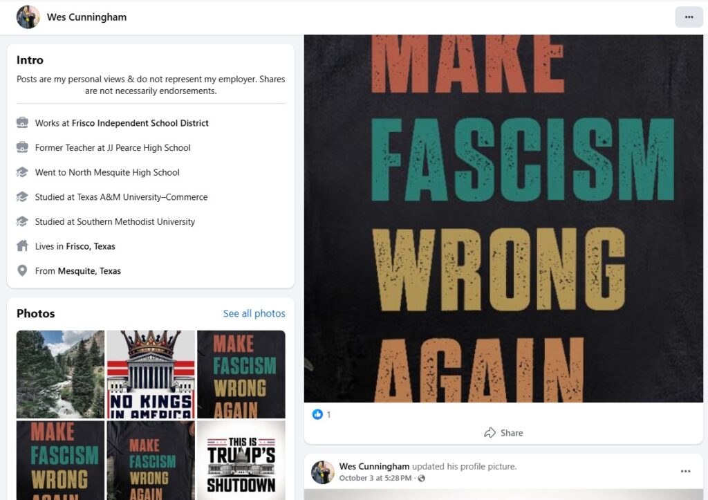 Cunningham’s posts were after hours and they did not use school resources, however, let’s talk about his INFLUENCE. He has influence over employees and what if he learns an employee disagrees with him, could he retaliate? He has INFLUENCE over curriculum? Next let’s look at the district letter sent out after the assassination of Charlie Kirk to be careful about posting politically driven content if their profile states they are an employee of Frisco ISD? Cunninghams profile clearly states he is a Frisco ISD employee.