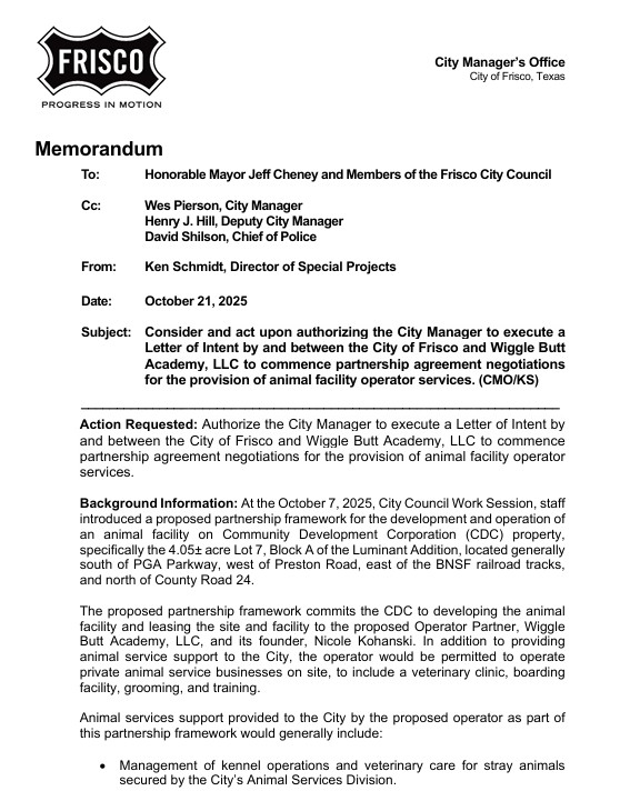 Heading into Tuesday night we took a look at what was on the City Council Agenda. The city just had a work session for the controversial Animal Holding Facility. At the October 7, 2025, City Council Work Session, staff introduced a proposed partnership framework for the development and operation of an animal facility on Community Development Corporation (CDC) property. The proposed partnership framework commits the CDC to developing the animal facility and leasing the site and facility to the proposed Operator Partner, Wiggle Butt Academy, LLC, and its founder, Nicole Kohanski. In addition to providing animal service support to the city, the operator would be permitted to operate private animal service businesses on site, to include a veterinary clinic, boarding facility, grooming, and training.