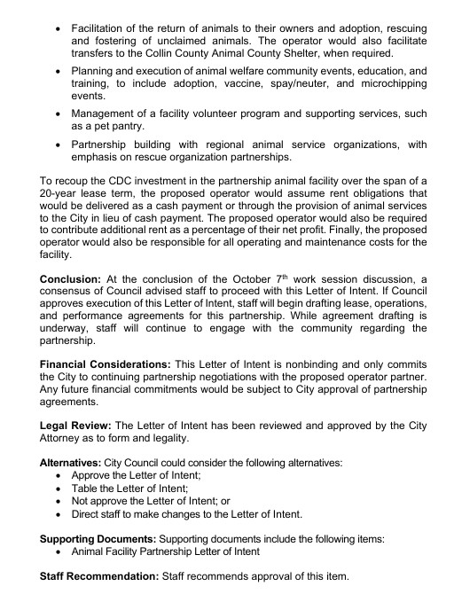 Because when the public’s trust is on the line, “nonbinding” doesn’t mean “no consequences.” REMEMBER THE COUNCIL MEMBERS WHO VOTE YES TO RUSH THE LOI FOR THE HOLDING FACILIYT BECAUSE IN MAY, YOU CAN VOTE THEM OUT! Let’s see if the two newest council members vote inline “just because it’s going to pass” or if they have the backbone to vote no, because they believe a full-service animal hub is what Frisco Residents want.