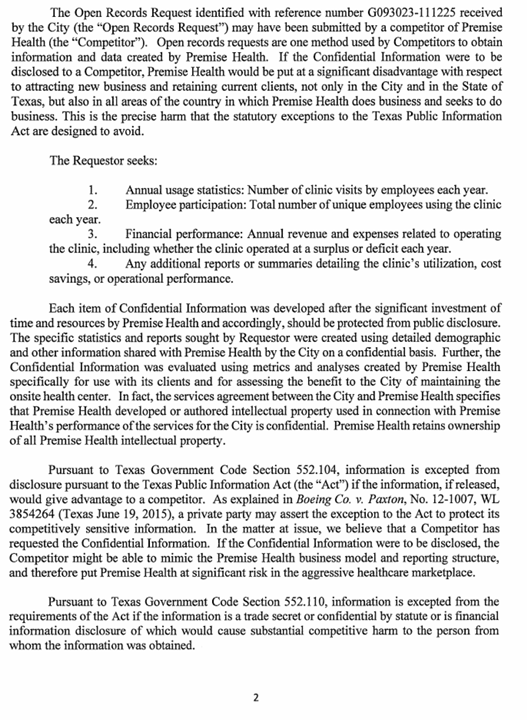 The City also notified Premise Health, the private contractor operating the clinic, giving them the opportunity to argue against disclosure under Section 552.305 of the Texas Public Information Act.