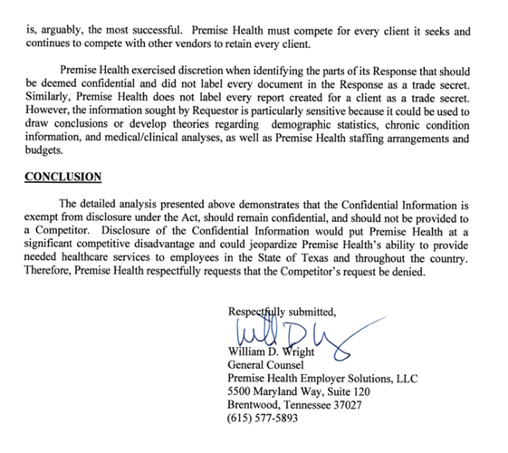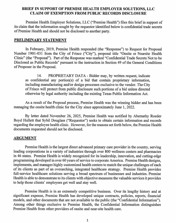 Premise Health, unsurprisingly, filed a brief supporting the City’s request to withhold information. (We’ll publish that response in full—because transparency is apparently contagious when citizens do it.)